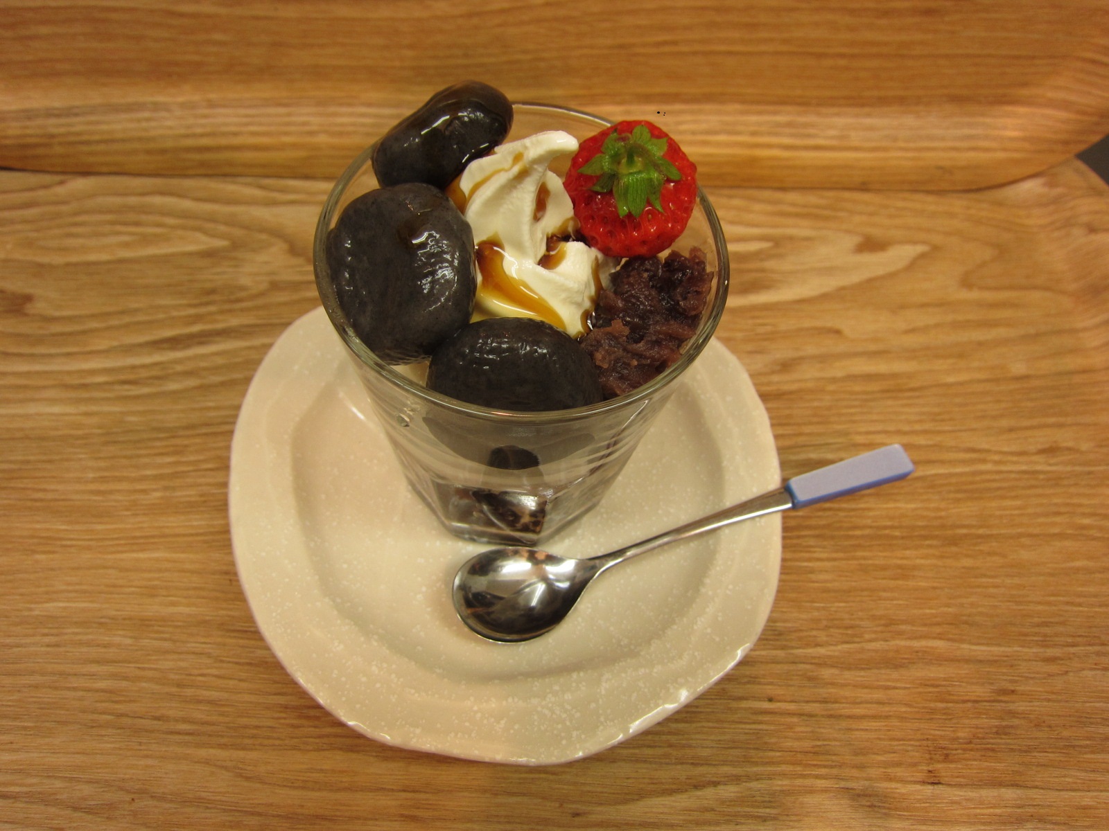 コーヒーゼリーにソフトクリームと黒ごま白玉だんごとあんこに黒蜜 そして 越後姫の豪華なサンデーです。