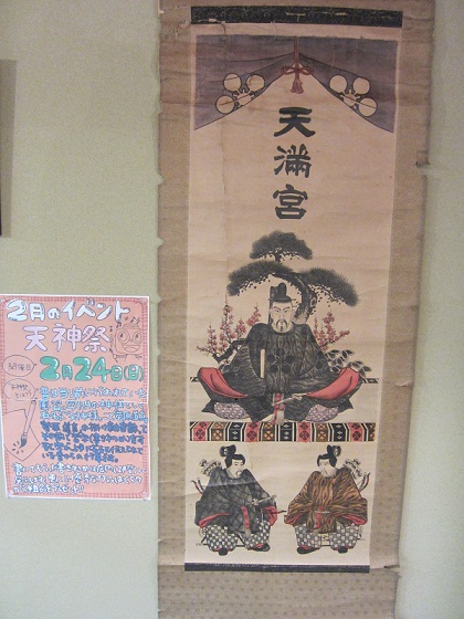 学問の神様として有名な「天神様」こと「菅原道真」の掛け軸を飾って、その前で習字をすると字が上手になると伝えられている・・昔からの行事です。