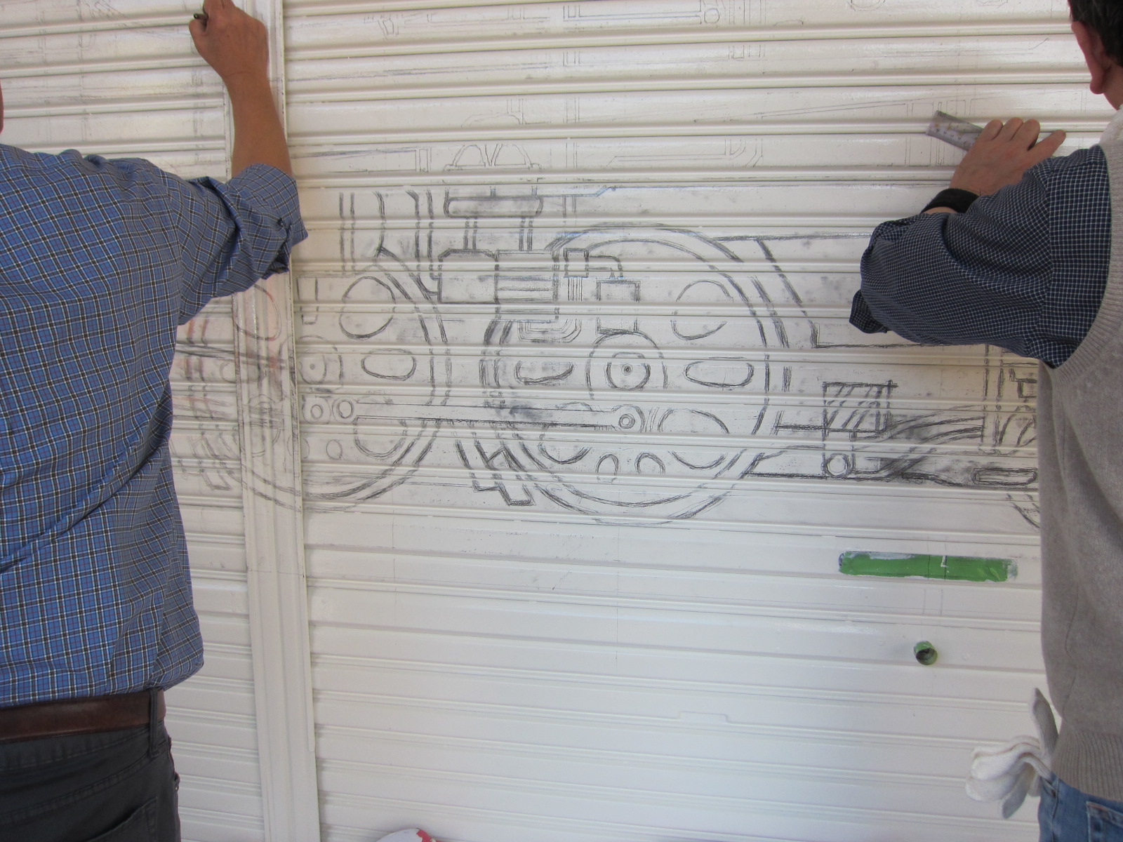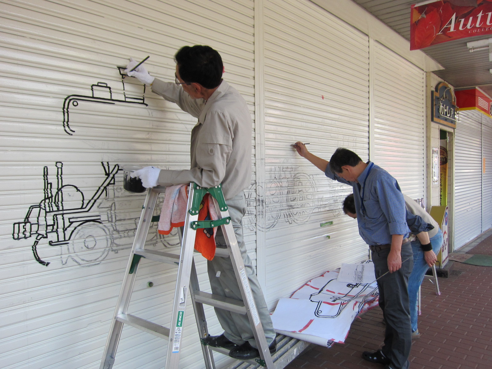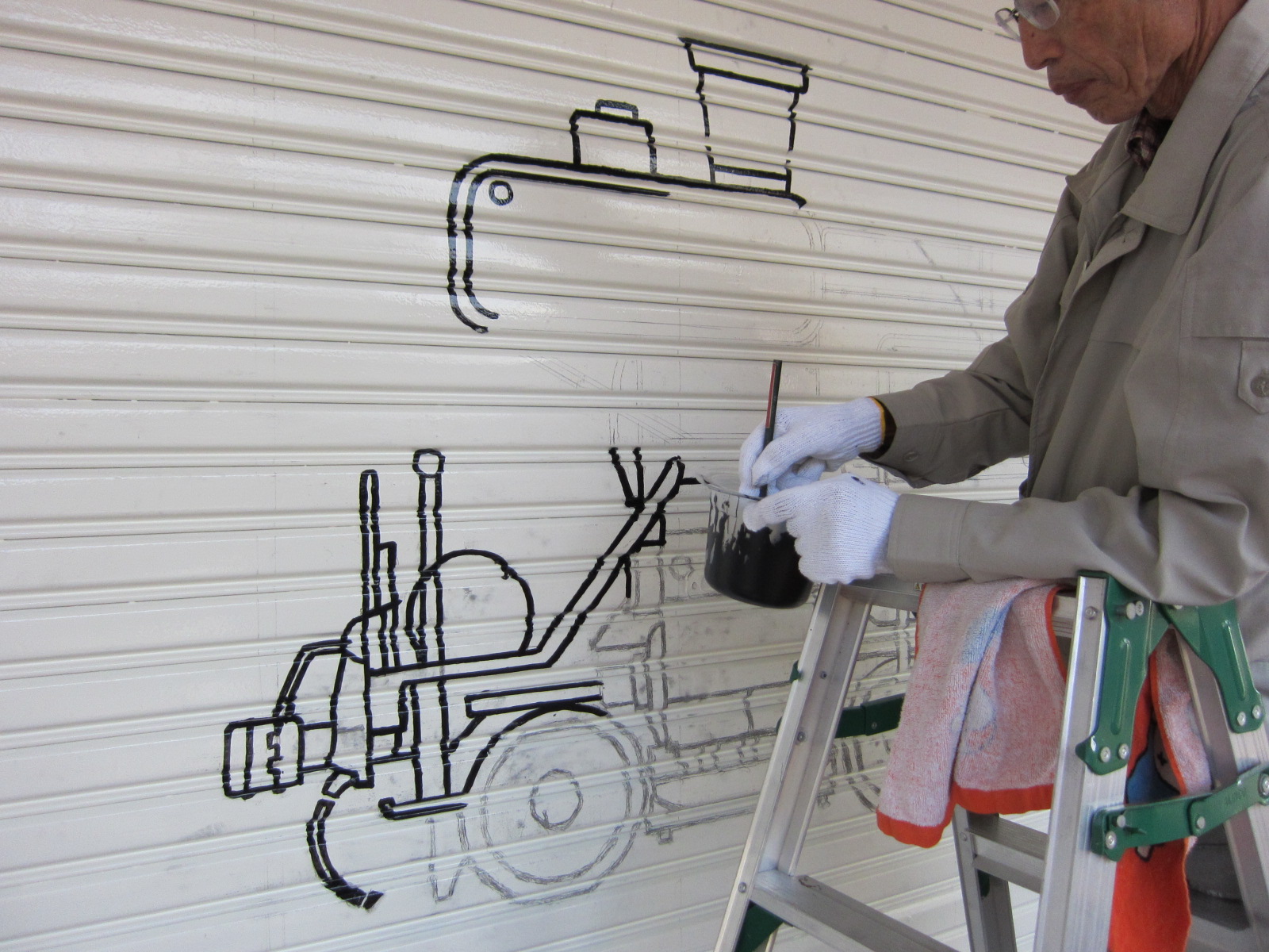先週 土日の二日間。商店街のシャッターにSLの絵を書いていると情報が入り カメラに納めてきました。
